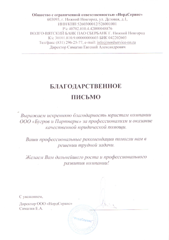 Благодарственное письмо от ООО "НордСервис"